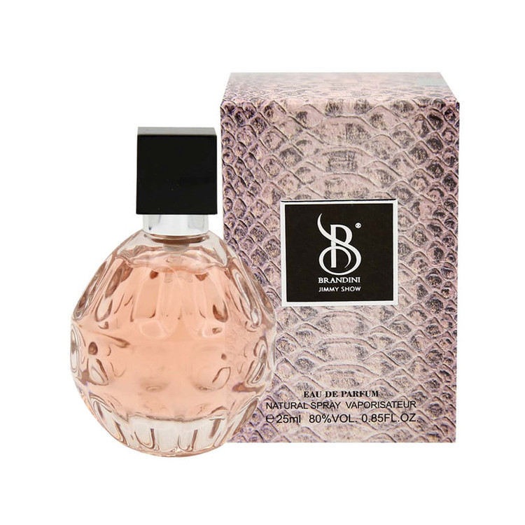 عطر جیبی زنانه برندینی Brandini مدل Jimmy Show حجم 25 میلیلیتر یکی از عطرهای تولید شده توسط این برند است که از نتهای گلابی، سدر، زنجبیل، گل محمدی، ارکیده، نعنای هندی و تافی تشکیل شده است و ماندگاری مناسبی بر روی پوست دارد. این عطر مناسب فصل پاییز و زمستان است.