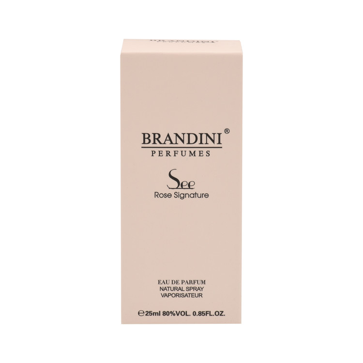 عطر جیبی زنانه برندینی Brandini مدل See Rose Signature در حجم 25 میلیلیتر یک عطر در گروه بویایی گلی و چوبی است. نت ابتدایی این عطر با رایحه ترنج، پرتقال ماندارین، فریزیا و انگور فرنگی سیاه آغاز میشود. سپس در نت میانی با رایحه رز، زنبق و اسمانتوس ادامه مییابد و در پایان وانیل، پچولی و آمبرت تکمیلکننده رایحه این عطر زنانه هستند. با اسپری این عطر زنانه بوی وانیل لطیفی استشمام میشود که احساس نرمی، لطافت و ظرافت زنانه را تداعی میکند.