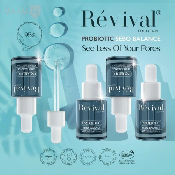 سرم پوست دارای منافذ باز پروبیوتیک رویوال ۱۵ میلی لیتر Revival Probiotic Pore Minimizing Serum 15ml؛ حاوی پروبیوتیک، اسید سالیسیلیک و نیاسین آمید است که با کاهش ترشح سبوم از غدد سباسه و حفظ بالانس فلور طبیعی پوست در کاهش اندازهی منافذ پوست چرب، مختلط و مستعد جوش موثر و مفید خواهد بود.
