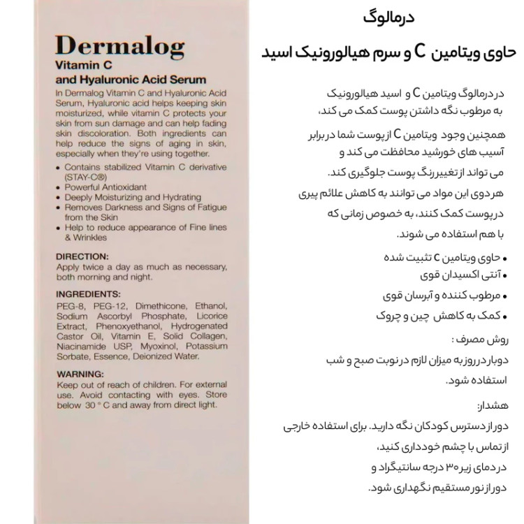 در این سرم هیالورونیک اسید موجب رطوبت رسانی پوست و ویتامین C با محافظت از پوست شما در برابر آسیب های نور خورشید به محو شدن لکه های پوستی کمک می کند.ترکیب منحصر به فرد این دو ماده در کنار هم سبب کاهش چروک و علائم پیری در پوست می شود.
