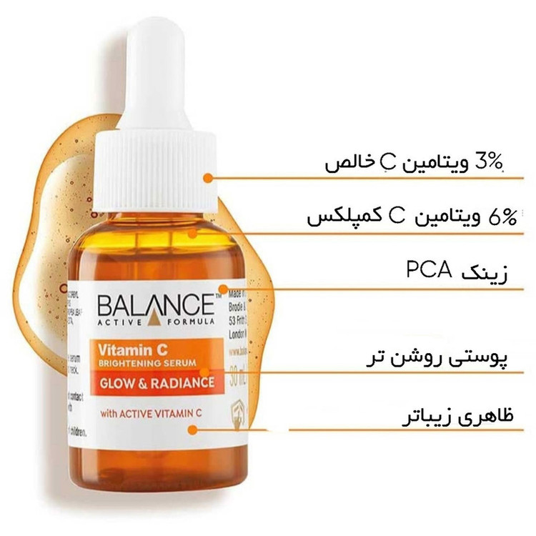 سرم ویتامین سی VITAMIN C بالانس روشن کننده و شفاف کننده پوست 30 میل (balance vitamin c brightening serum) حاوی ویتامین c است که منجر به کاهش لکه ها و همچنین منجر به روشن شدن پوست می شود این سرم به حفظ قوام پوستی و یکدست کردن سطع پوست کمک می کند. سرم ویتامین سی بالانس باعث کاهش جوش و صاف شدن جای جوش میشود و لک های پوست را روشن وبه مرور جذف می کند.یکی از خواص ویتامین سی برای پوست جوانسازی و به نهایت رساندن سلامت و زیبایی پوست است و به این دلیل اکثر سلبریتی ها و بیوتی بلاگر ها مطرح جهان در روتین روزانه خود حتما سرم ویتامین سی پوستی استفاده میکنند. محصولات شرکت بالانس اکتیو فرمول انگلیس با جدیدترین فرمول روز دنیا و با بالاترین کیفیت و قیمت بسیار مقرون به صرفه یکی از برندهای مطرح در زمینه حفاظت و مراقبتی تخصصی پوست خود را مطرح کرده است. این برند دارای بالاترین تاثیر همانند بهترین و گرانترین برندهای دنیا عمل میکند. سوراو نماینده و وارد کننده مستقیم این برند از اروپا میباشد.