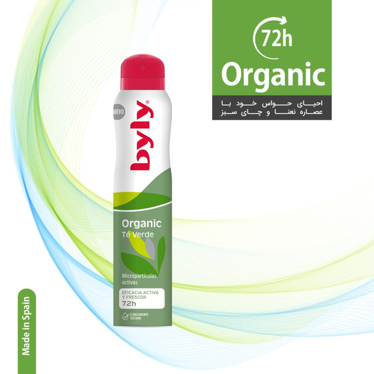 با Byly Organic Té Verde جدید می توانید، زیرا به طور طبیعی به زیر بغل شما طراوت و شادابی می دهد و تا 72 ساعت احساس محافظت ایجاد می کند. فرمول آن با ریزذرات فعال باعث می شود تا در شرایط پیچیده تر احساس طراوت ماندگاری بیشتری داشته باشید. علاوه بر این، حاوی چای ارگانیک و نعناع است. به عنوان یک دئودورانت اسپری که در یک بطری آئروسل تحت فشار قرار می گیرد و روی پوست زیر بغل پودر می شود، خیلی سریع خشک می شود و برای استفاده در هر زمانی از روز، حتی زیر لباس ایده آل است.