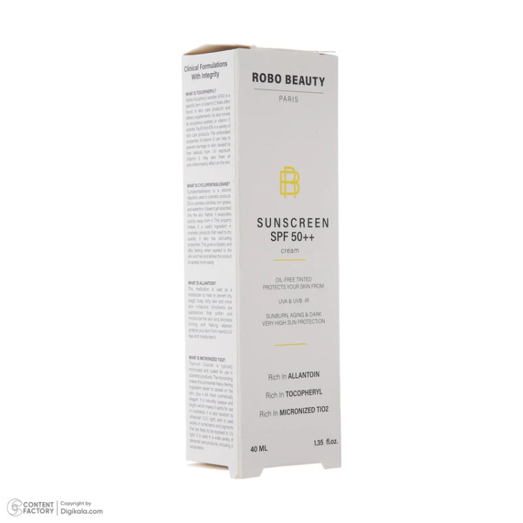 روبو بیوتی؛ کرم ضد آفتاب رنگی با SPF ۵۰«روبو بیوتی» با ارائه کرم ضد آفتاب رنگی خود با دارا بودن SPF ۵۰، بار دیگر نشان میدهد که چگونه میتوان با استفاده از فرمولاسیونهای پیشرفته و بهینه، پوست را در برابر تابشهای زیانآور خورشید محافظت کرد. این محصول بدون روغن و کاملا Oil Free است و به همین دلیل، هم برای پوستهای چرب و هم برای پوستهای خشک مناسب است. علاوه بر این، این کرم محافظ، با قابلیت مقاومت در برابر اشعه UVA و UVB، حفاظت کاملی را علیه خطرات ناشی از تابش خورشید فراهم میکند.• بدون روغن بودن و باعث نشدن چربی اضافی روی پوست• این کرم، با داشتن SPF ۵۰، یکی از بالاترین سطوح محافظت در برابر اشعههای خورشید را فراهم میکند.