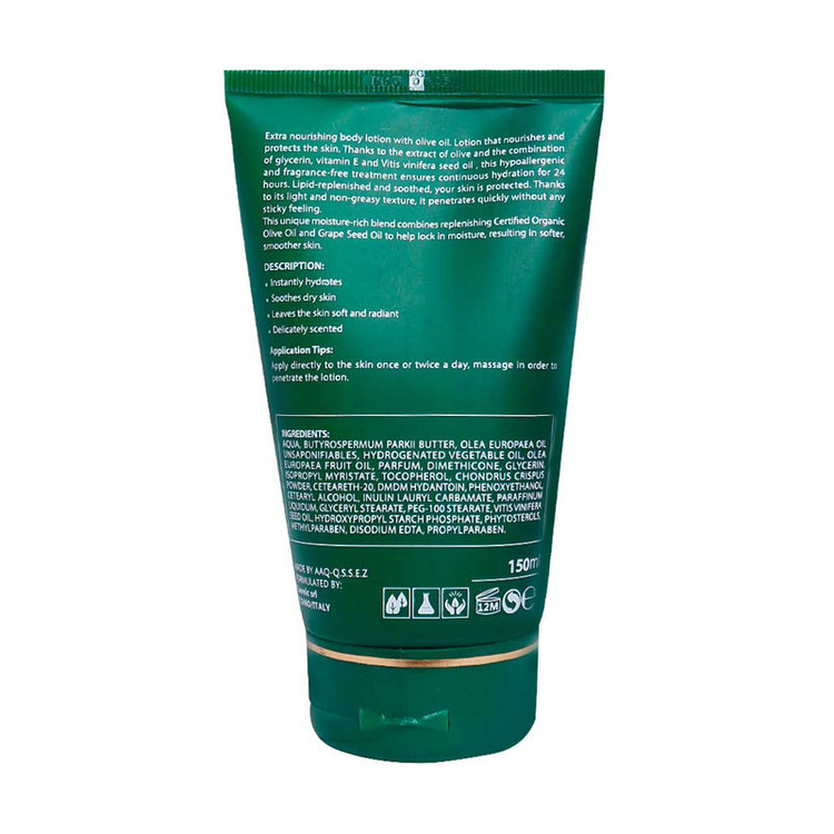 آب دیونیزه، بوتیروسپرموم کره پارکی، روغن زیتون، غیر صابونی، روغن گیاهی هیدروژنه، روغن میوه زیتون ، عطر، دی متیکون، گلیسیرین، ایزوپروپیل میریستات، توکوفرول، کندروس کریسپوس پودر، سیترث-۲۰، کاربامات، پارافین مایع، گلیسریل، دی سدیم ادتا، پروپیل پارابن.